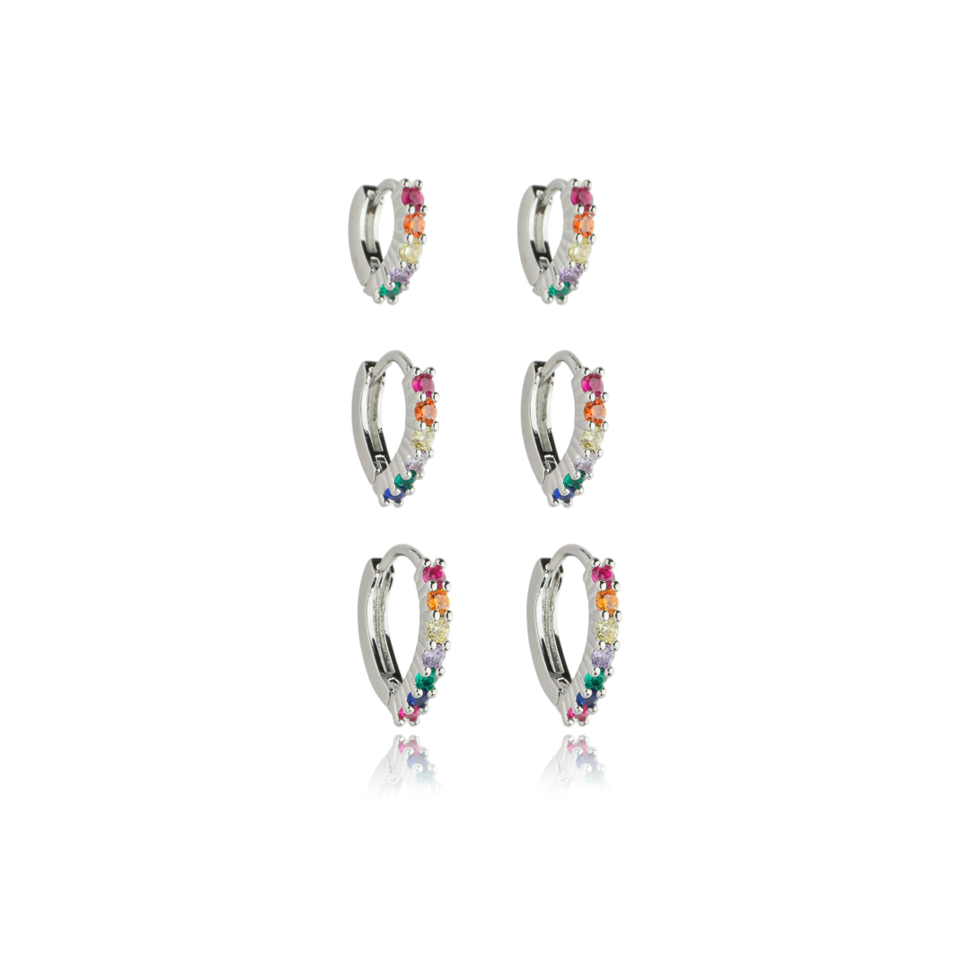 Brinco de trio com zirconia rainbow banho em rodio branco