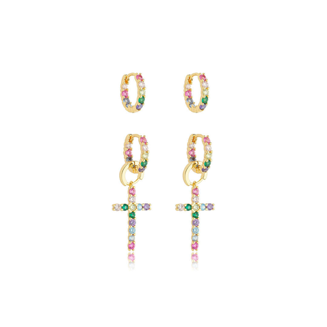 Brinco de argola duplo cravejado de zirconia rainbow banho em ouro 18k