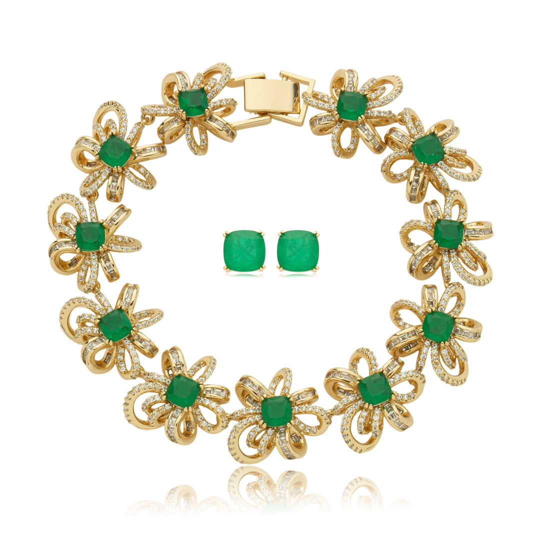 Conjunto de brinco e pulseira cravejado zircônia cristal com pedra fusion esmeralda