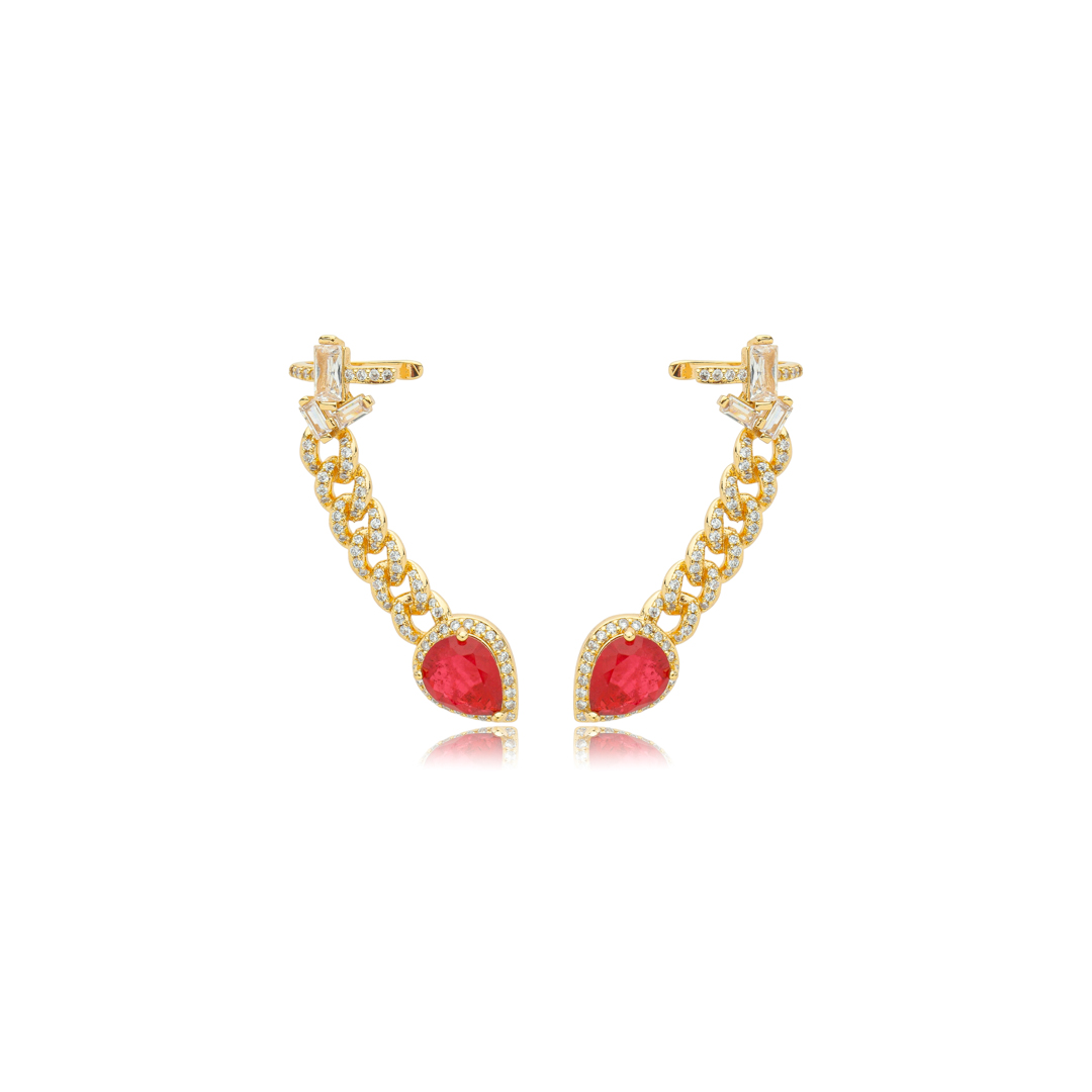 Brinco ear cuff cravejado de zirconia pedra fusion rubi banho em ouro 18k