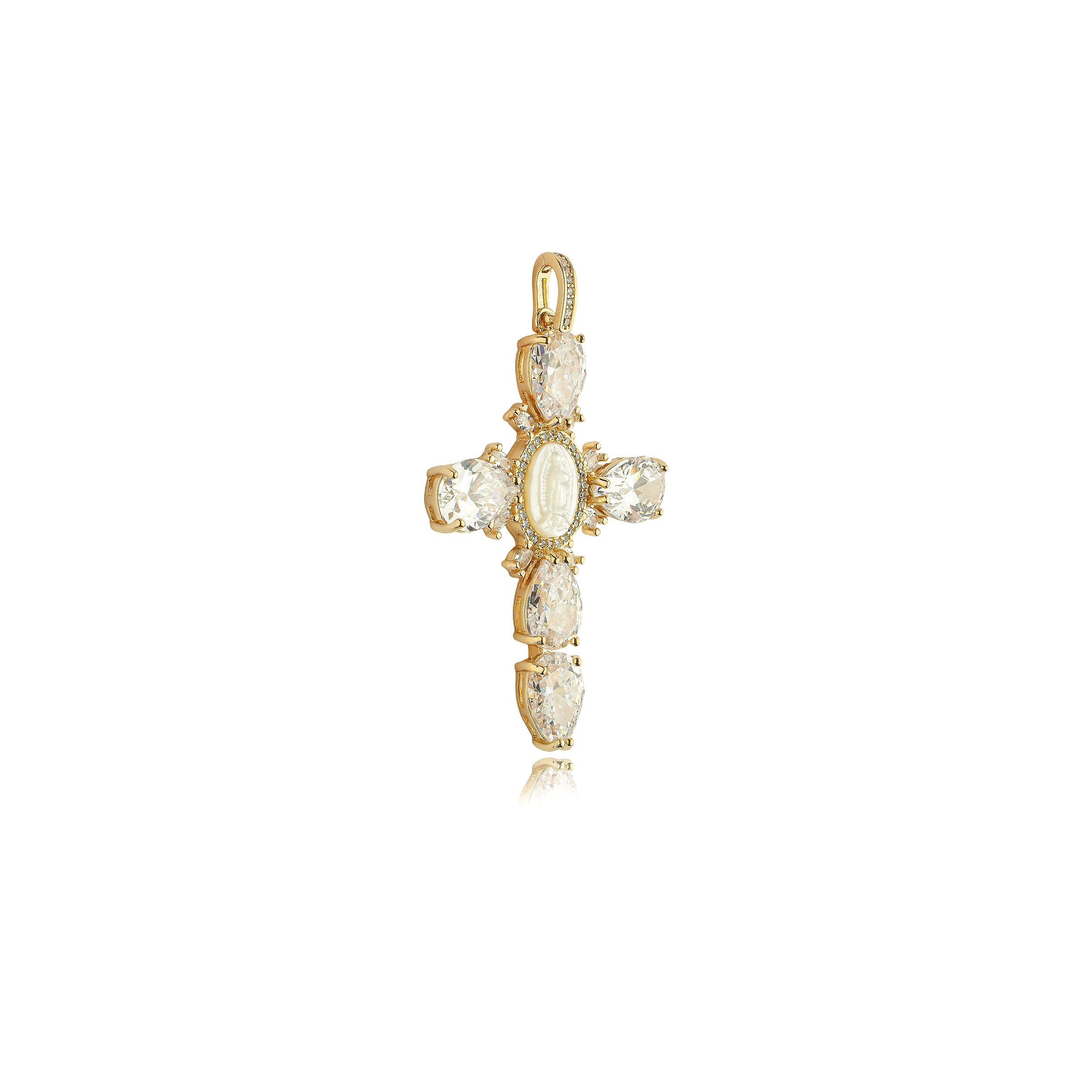 Pingente de cruz cravejado de zircônia cristal com detalhe em madre pérola