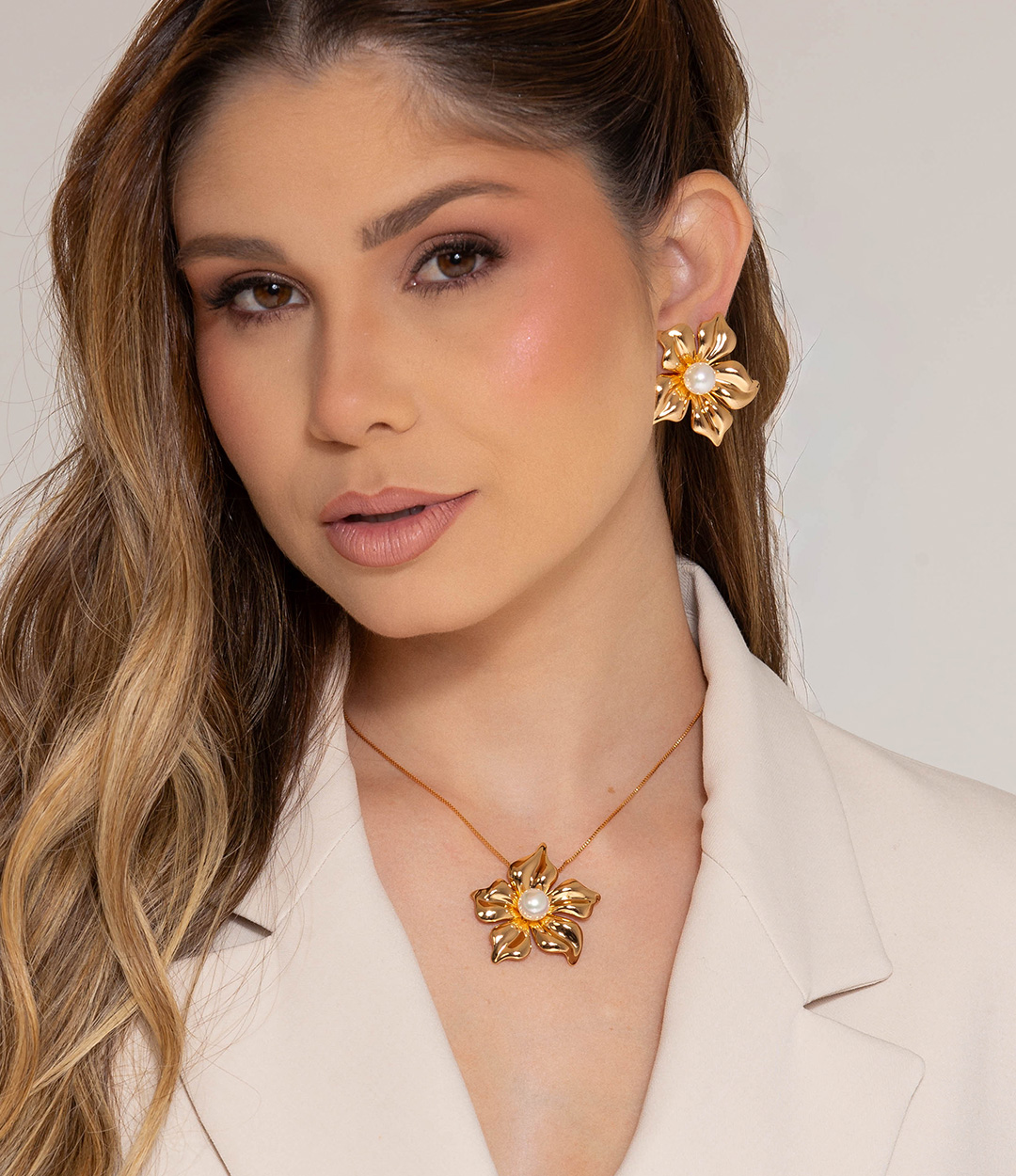 Conjunto de brinco e colar de flor liso com pérola shell