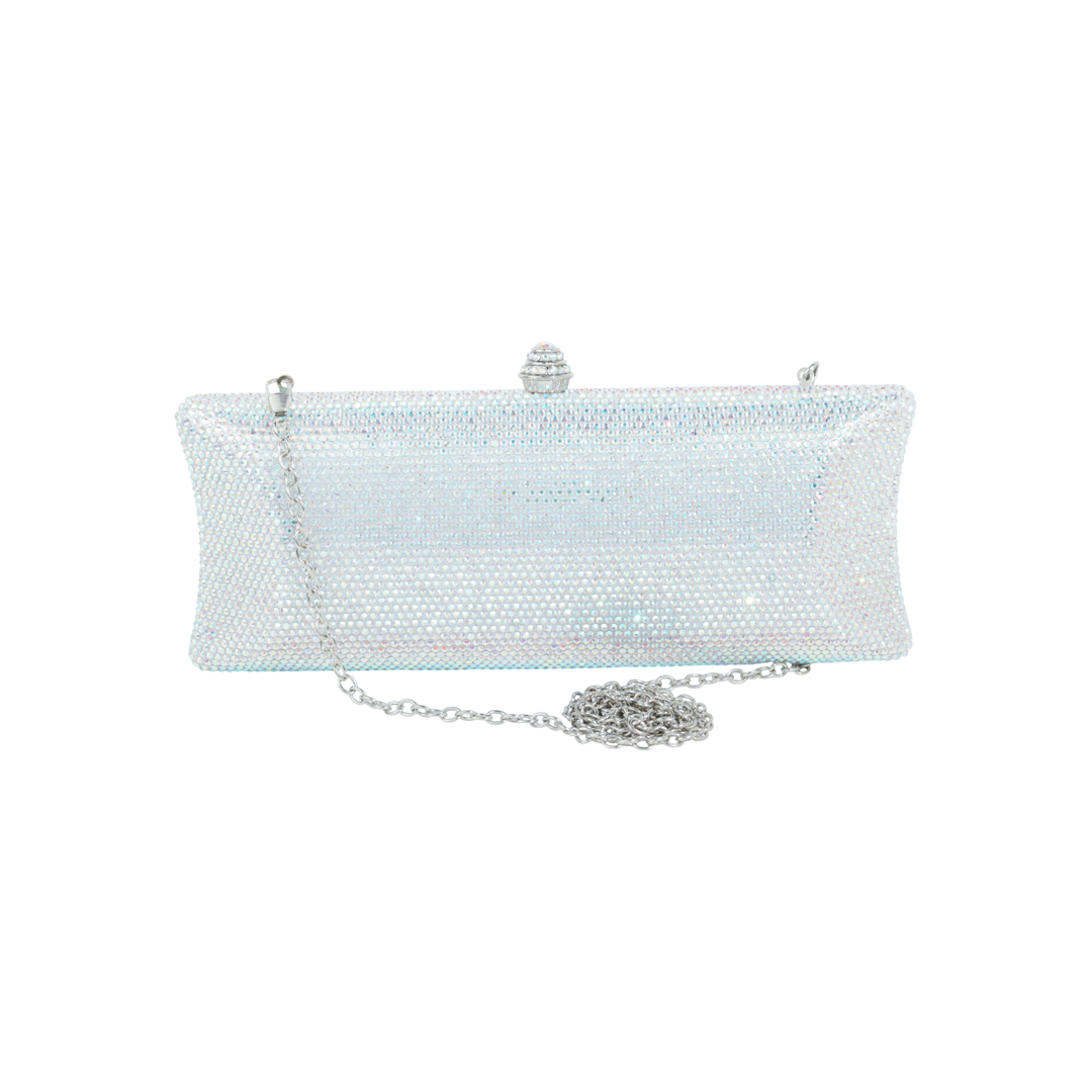 Elegância absoluta em cada detalhe. A clutch é confeccionada em estrutura de metal e inteiramente cravejada em cristais, criando um brilho sofisticado e atemporal. Seu design compacto traduz exclusividade, enquanto a alça removível em metal oferece versatilidade para transitar entre mão e ombro com a mesma imponência.