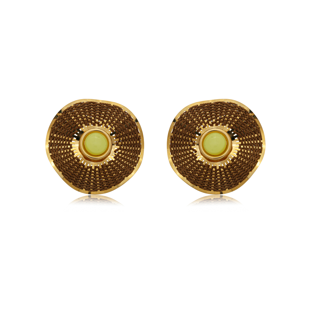 Brinco artesanal banhado a ouro 18k, desenvolvido manualmente com delicado trabalho em palha. O design ganha destaque com pedra de resina esmaltada ao centro, trazendo sofisticação e um toque contemporâneo à peça. Leve, elegante e perfeita para valorizar qualquer produção.